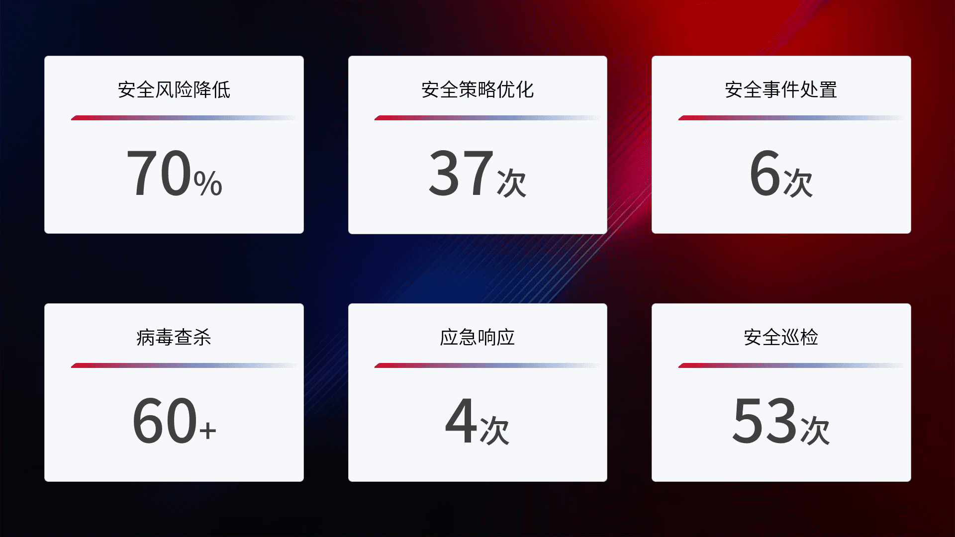 提供全面的安全事件报告体系,,,,包括处置报告、、、周报、、季度和年度总结,,结合持续监控,,,,帮助客户深入了解网络安全状况。。。